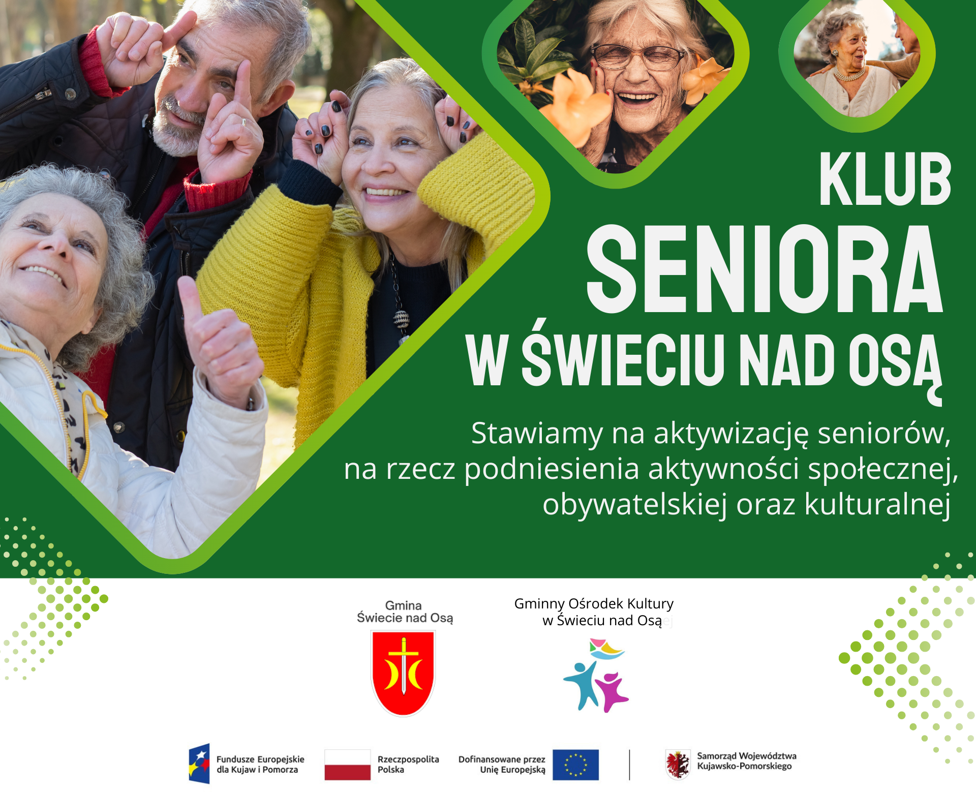 Projekt będzie realizowany zgodnie ze Standardem klubów seniora współfinansowanych z EFS+ w ramach Działania 7.4 programu Fundusze Europejskie dla Kujaw i Pomorza na lata 2021-2027.