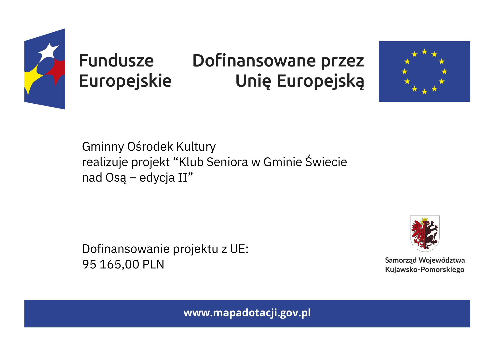 Projekt będzie realizowany zgodnie ze Standardem klubów seniora współfinansowanych z EFS+ w ramach Działania 7.4 programu Fundusze Europejskie dla Kujaw i Pomorza na lata 2021-2027.